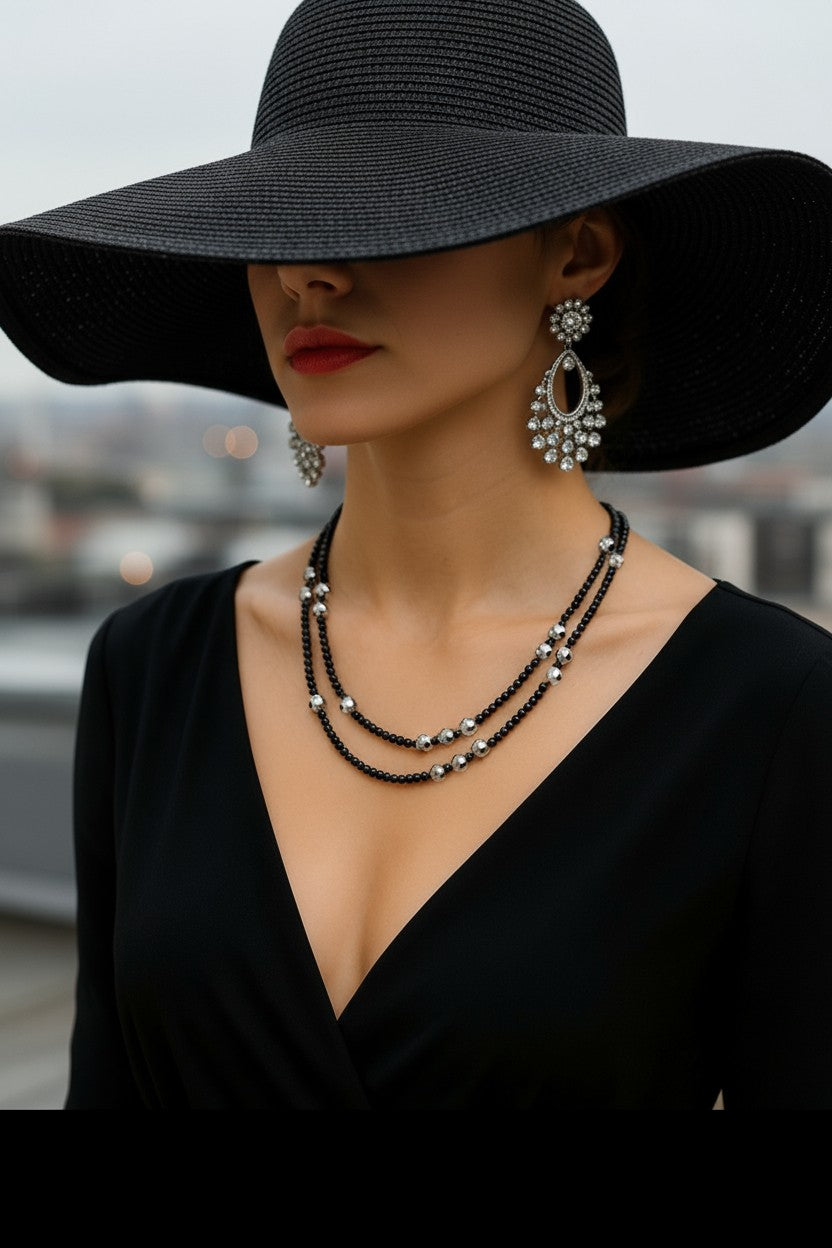 Kolyenin her bir katını, derin siyah rengi ve yansıtıcı yüzeyiyle bilinen parlak Oniks taş boncuklar oluştururken aralarına yerleştirilmiş parlak ve fasetli gümüş renkli Hematit taşlar kolyeye dinamik bir ışıltı ve modern bir dokunuş katmaktadır.